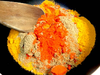 ターメリック、レッドペッパー、・・・などのパウダースパイスで味の基本を作ります。